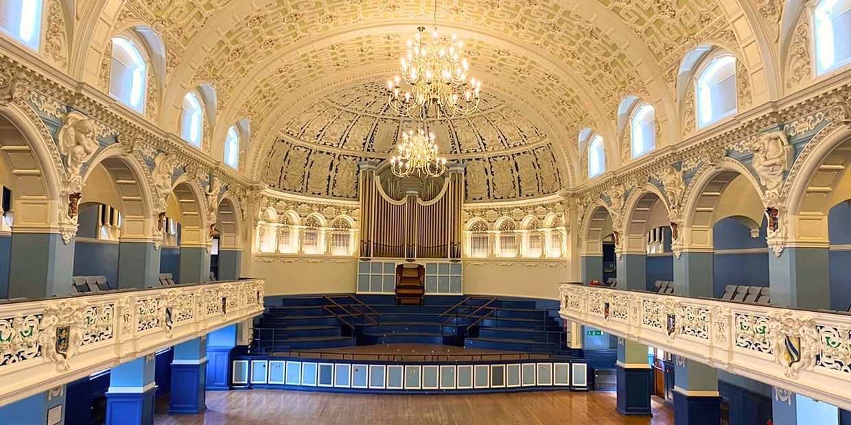 The majestic Main Hall of Oxford Town Hall commands attention with its soaring domed ceiling, sweeping balconies and expansive stage.